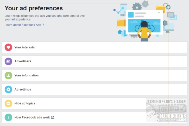 You should see five categories; Your interests, Advertisers, Your information, Ad settings, and Hide ad topics. Have a seat because this is going to take a while.