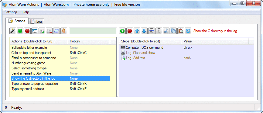 AlomWare Actions Lite is semi-programmable with a super-friendly interface, and powerful but simple scripting steps can be easily learned by anyone to launch apps and automate tasks in ways that other tools can't. You can also use the pre-defined actions which are in included in the Alomware Actions Library to get you started.