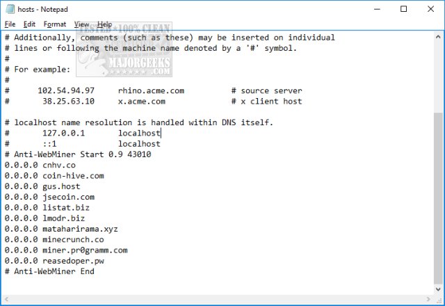 At the time of this review, it only adds nine websites to block in your HOSTs file. Screenshot four below shows what our host file looked like after enabling AntiWebMiner. If you'd like to simply modify your own host file, here's the current list: