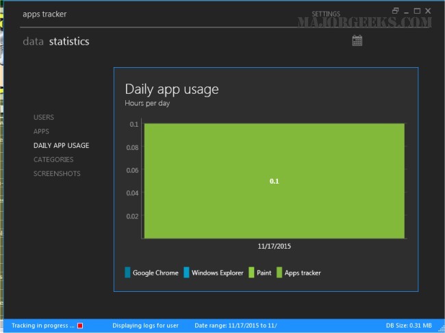 apps tracker allows you to monitor activity, keystrokes, screenshot captures, email reports, application blocking, and file changes and will provide statistics compiled in an easy to read chart for analysis. You can also set apps tracker to monitor other users - like your kids, or employees, etc.