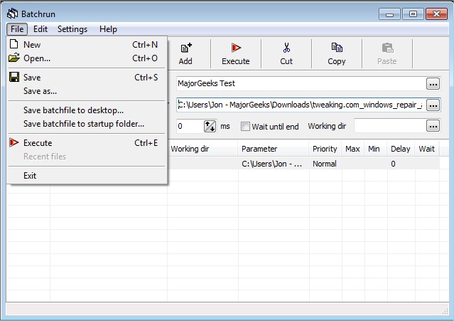 A batch file lets you run several Windows commands together, in whatever order you choose. Start Batchrun, add the applications you would like to run together or one after another, then select "File | Save to Desktop" and you have just created your first batch file.