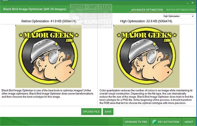 It is simple to use, upload your picture and select from the provided optimization levels which include high, medium, low, and brutal in the free version then save your optimized image to a folder of your choosing.