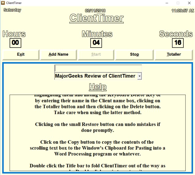ClientTimer is an interesting app but has a few shortcomings that most should be able to overlook. Besides the scrolling text, the application is not very polished in appearance, but still, easy enough to use. The most glaring feature missing is the ability to save clients names. Once you close an active window, it's gone. There's no save feature so you can track multiple times and indeed no export or import. It's a huge oversight to add a job and client name and not be able to save it. Your only option is to copy and paste the results into your favorite text editor.