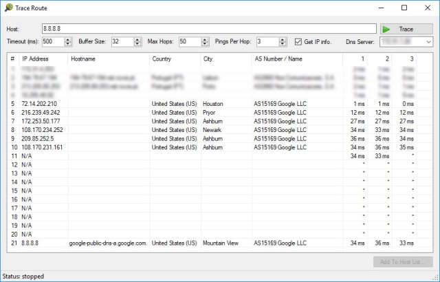 Shows the route (hops) through the network between your computer and a specified destination computer.