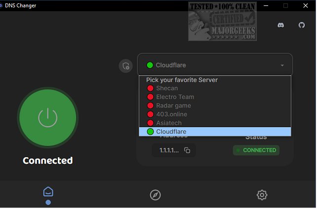 DNS Changer is displayed from a simple UI. All your options are a click away. You can easily select one of the provided DNS servers and connect to it quickly. When using the newly assigned DNS server, you get the server address, ping, and status displayed within the UI for fast reference. You do not have to use the DNS servers provided; DNS Changer allows you to add your own easily.