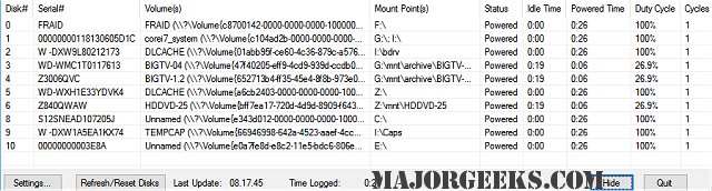 All information gathered is displayed within a simple grid-based UI that provides details on Hard Disk Drive power on time, and times they are cycled. The information is broken down by disk number, drive serial numbers, volume IDs, status, idle time, duty cycles as well as mount points for each detected drive.