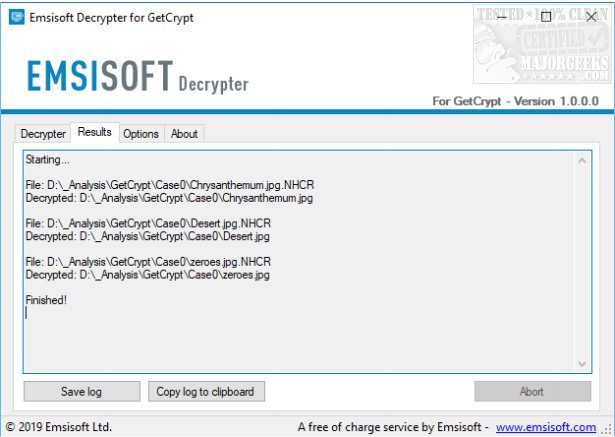 Emsisoft Decrypter for GetCrypt will inform you that the decryption process is complete. If you require a report for your records, you can save it by clicking the Save log button. You also have the option to copy it straight to your clipboard for use in emails, forum posts, etc., if needed.