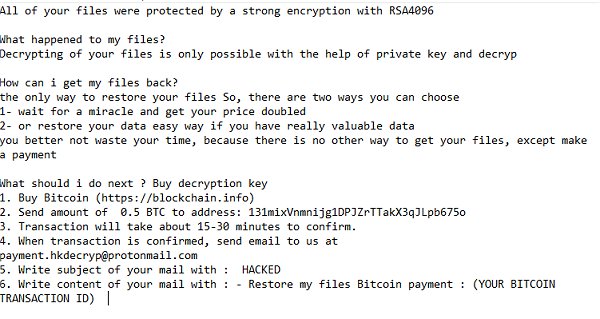 HKCrypt first showed up in late 2017. It encrypts a victim's files using the RC4 algorithm, then adds the extension ".hacked" to files. This nasty little bit of malware pretends to be running a Windows update to fool you, then shows a lock screen requiring that you contact "payment.hkdecrypt @ mail.ru."