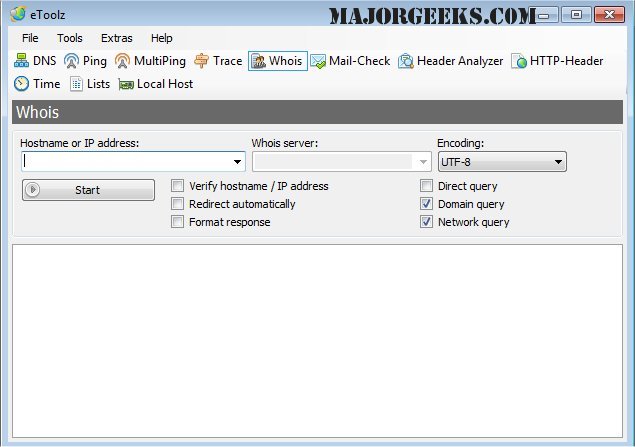 This handy application will provide you with essential tools like DNS-Lookup, Ping, TraceRoute, and Whois and allow you to check e-mail addresses and shows domain information entries.