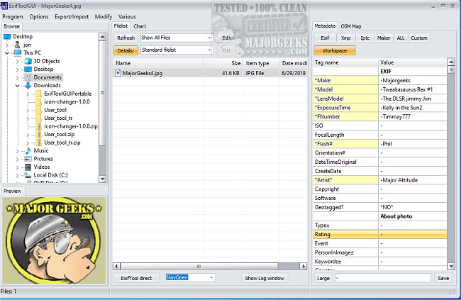 Moreover, ExifToolGui Portable can geotag images from GPS track log files, generate track logs from geotagged images, and fix image timestamps. It can also rename files, organize them in directories (by date or any other meta information), copy/delete meta information between files (even different-format files), and read/write structured XMP information.