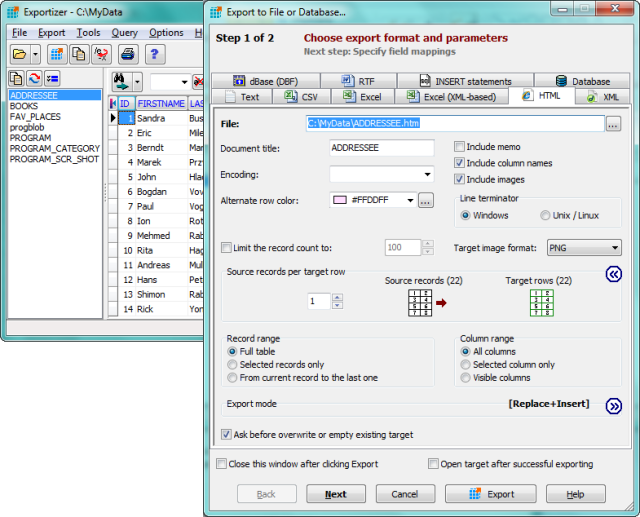 Exportizer works via BDE or ADO. It can convert DB, DBF, text, CSV to text, CSV, XLS, RTF, XML, HTML, DBF, and INSERT statements. Many export options ensure full control over the output. It is possible to specify the source-to-target field mappings. Export operations can be performed either via the program interface or the Command Line with many parameters. You can quickly generate the needed command line directly from the GUI.