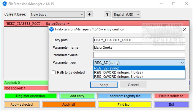 The utility only works with entries in registry branch HKEY_CLASSES_ROOT and only with parameter types REG_SZ, REG_DWORD, and REG_QWORD.