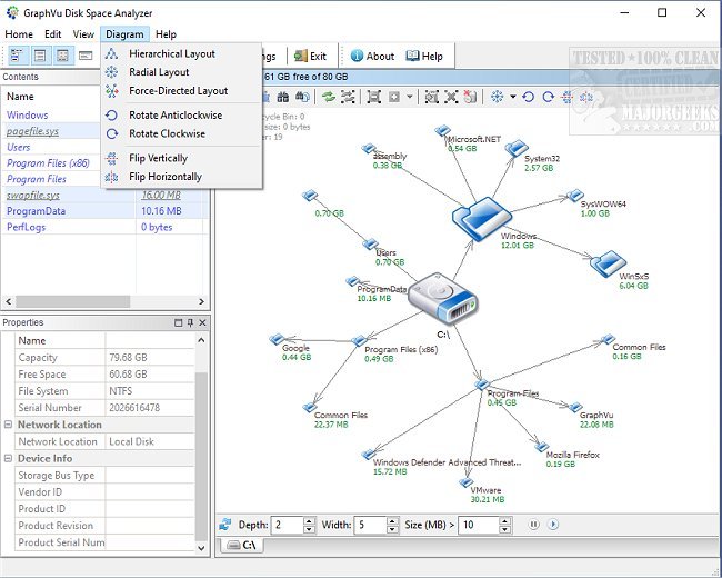 Disk Space Analyzer gives you the ability to configure diagram layouts via selection for the depth of field and dimensions of the panes displayed. It can also be set to either show or hide the path, subtree, or the files present in each of the displayed folders. You can also truncate long names, as well as resize, rotate, etc., the graph.