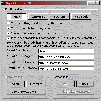 HijackThis, a general homepage hijackers detector and remover. Initially based on the article Hijacked!, but expanded with almost a dozen other checks against hijacker tricks. It does not target specific programs/URLs, just the methods used by hijackers to force you onto their sites.