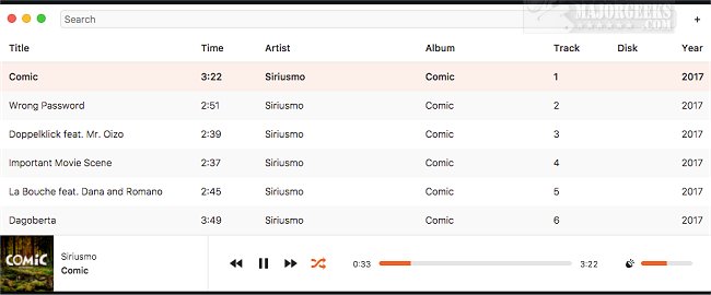 This app is a straightforward audio player with a simple user interface. The layout includes a playlist panel in the center, a search bar at the top, and a control bar at the bottom. While its appearance may not be extraordinary, it gets the job of playing your tunes done.