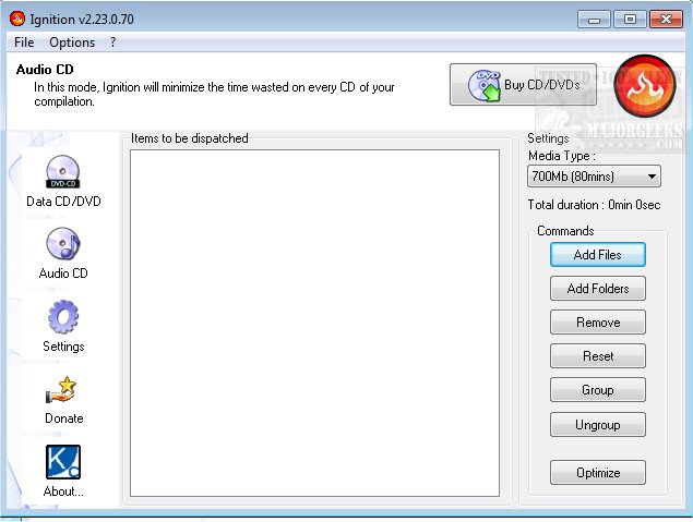 Ignition is a file organizer tool that minimizes the number of CDs required to burn a massive number of files.