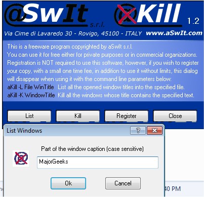 You can also export a list of all the opened windows (or only those that matches a specified title) into a text file, so that an external application can know in advance if a specific application is on execution, so it can decide whether to kill it or not (and which is the exact title to specify).