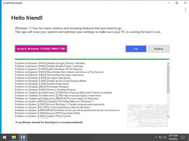 LoveWindowsAgain's interface is to the point allowing for ease of use. Once run, it will display a simple start page where you can analyze common deficiencies and annoyances. It will quickly perform the analysis and provide you with the results. From there, you can fix them all or jump over to the advanced mode for recommendations on key areas where you can check or uncheck precisely what you want. After hitting fix, all the necessary registry mods and setting changes are performed quickly. Don't like the changes? Reverting is as easy as hitting the restore button to return to the default state. Even so, it is always a good idea to create a registry backup.