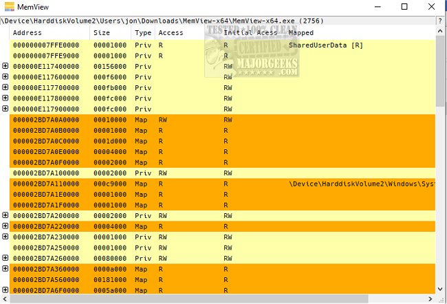 MemView provides a comprehensive overview of all the mapped memory and its associated protection settings within a given process. MemView enables users to gain a deeper understanding of how memory is being utilized in the system. It will display memory grouped based on allocations.