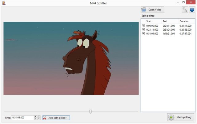 With MP4 Splitter, add the video you want to split, use the slider to add your split points, then select start splitting.