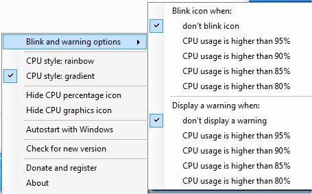 My CPU Monitor is a small, lightweight tool that accurately keeps track of cpu usage in real time - right from the systray. The tool uses two simple icons, one shows percentage meter and the other provides a processor load graph. It allows you to choose at what predetermined level a high usage warning is displayed. You have 2 choices of warning type; you can have the icon blink or show a warning message. This is not a fancy tool, but it does the job and keeps you informed.