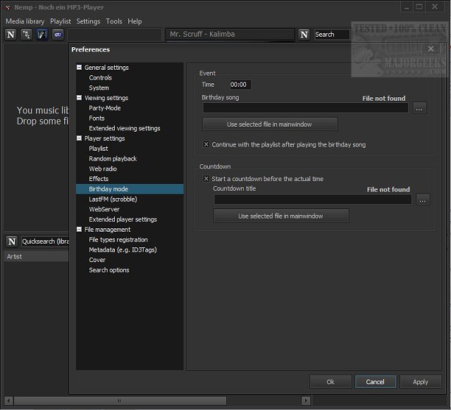 Nemp is a free and feature-rich portable music player for Windows that excels at managing large collections of music with its powerful media library. In addition to standard features, it boasts some unique capabilities, such as an integrated web server for remote control of the player and various gadgets like a "Happy-Birthday-Timer" that can automatically insert a birthday song into the playlist at specified times.