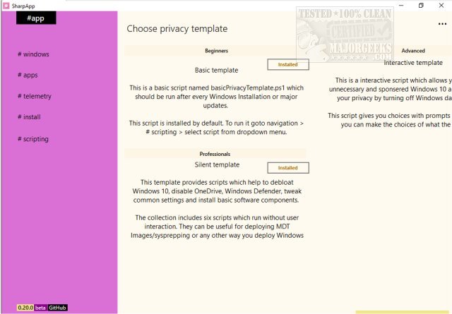 SharpApp runs as a portable app. You can choose from Beginner, Advanced, or Professional to download scripts.