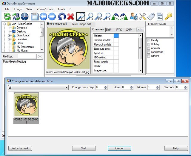 At its core, QuickImageComment provides a user-friendly way to modify image data. It also has organizational tools for keeping an image collection in order, like special masks for synchronizing recording times of a set of images taken with different cameras. Images can then easily be grouped by properties (mostly camera models). For each of those created groups, you can enter a shift of the recording time. This process will allow the images to be time-sorted.