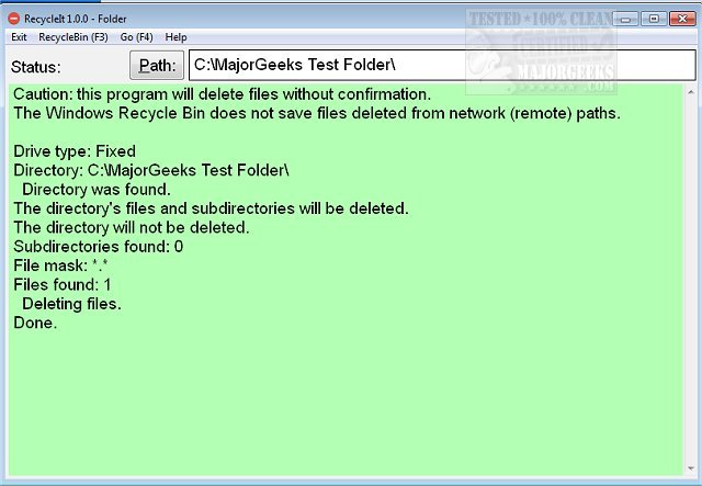 Using RecycleIt is simple, you have three options for specifying files/folders for deletion; you can use the "Path" button to select a folder, specify a file path or folder path in the "Path" form field or specify a file path or folder path through the command line.
