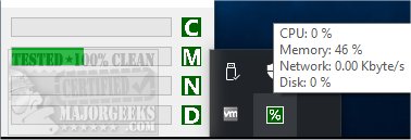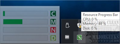 Resource Progress Bar is portable and runs in the tray. If you click on it in the tray, it will bring up a small, resizable window with the letters C, M, N, and D and show you the current usage. Double-click that window, and it will close and return to the tray.