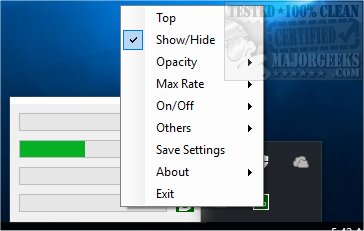 Right-click on the tray icon and you have numerous settings for this free app. Set it to the top, show or hide, max rate, opacity, choose which of the four choices to monitor, HDD and network LED, autostart, opacity, etc.