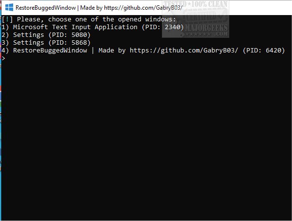 RestoreBuggedWindow scans all currently active windows and presents them in a numbered list. You need to choose the corresponding number of the window experiencing issues, and the application will endeavor to resolve the problem. In most cases, this process is effective, allowing you to continue your work without further interruptions.