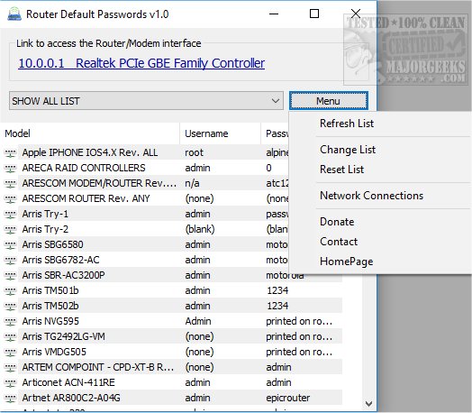 Router Default Password is a freeware, and portable app to get the username and password of your router and make it a clickable link.