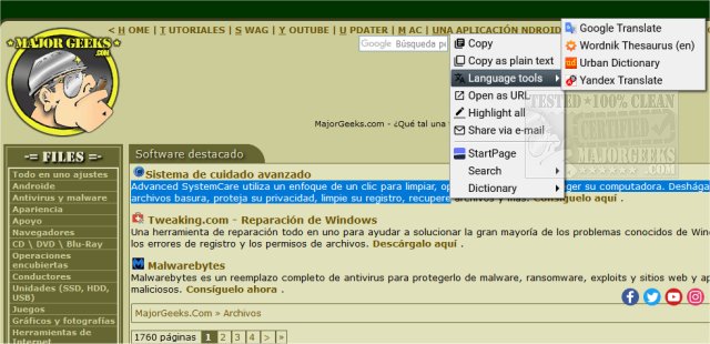 SelectionSK for Chrome and Firefox groups, many tools for text translations, dictionary definitions, etc., from the right-click context menu.