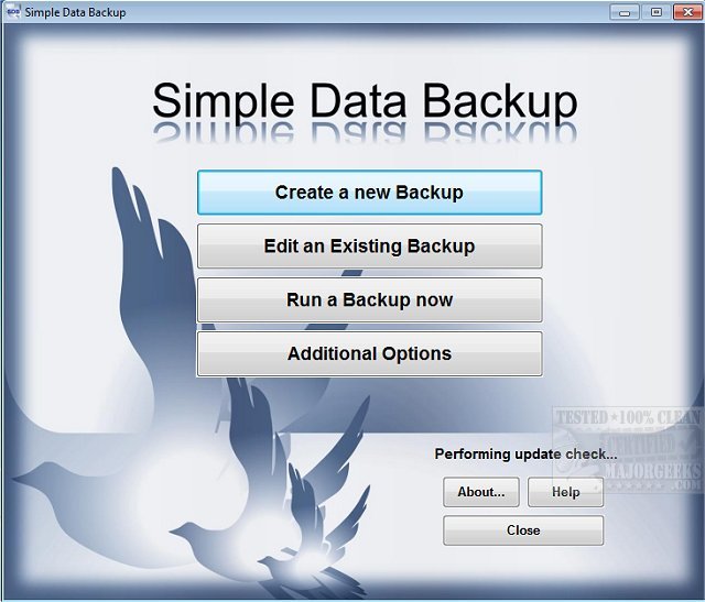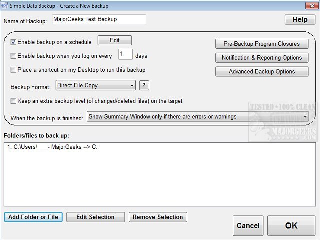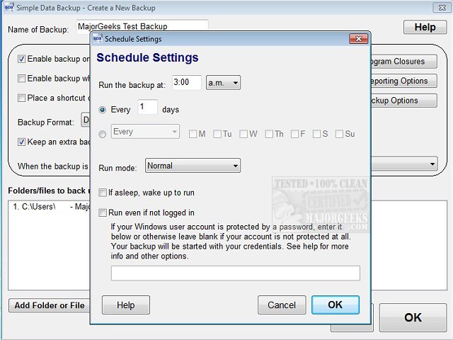 You will be able to perform on-demand backups of all your folders/files drive to drive, on a custom schedule or whenever you log on to your machine. Simple Data Backup can also be utilized to back up to a network drive, flash drive, or another hard drive to the Cloud using FTP, SSH, WebDAV, etc. If you need to create an identical folder/file structure on a backup drive, it allows you to compress the data as .ZIP or LZMA-compressed .7z files.