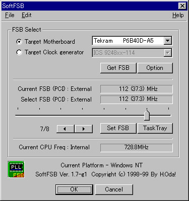 The purpose of this Windows application is to change the base clock(FSB) frequency without restarting the system. Any FSB changes are instantaneous. It runs on Windows 95/98 and Windows NT 4.0/5.0 in both Japanese and English mode.