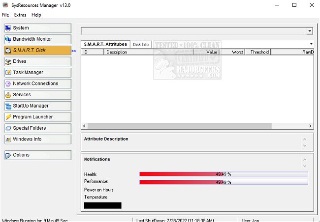 SysResources Manager displays some extra information about your system without being overly complex for the sake of being complicated. It has multiple areas of interest accessible through the left side of the interface. In the System tab, you can see a summary of your CPU, RAM, and disk usage. Additionally, the Bandwidth Monitor offers an interface for your network adapter, displaying vital information about your download and upload speeds and other network data. To better control your network usage, you can view the Network Connections to identify the applications currently using your bandwidth. Additionally, the S.M.A.R.T. Disk and Drives menus provide comprehensive drive data, and the program includes task manager and services sections. One noteworthy feature of the task manager is the ability to view the tasks, modules, and registry keys associated with a particular process.