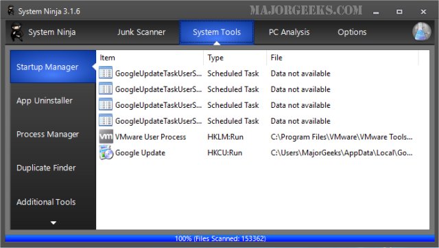 It contains a unique dual cleaning engine. It scans your entire hard drive performing a thorough initial scan, identifying junk based on heuristics. System Ninja then continues to check locations known to contain junk based on several routines.