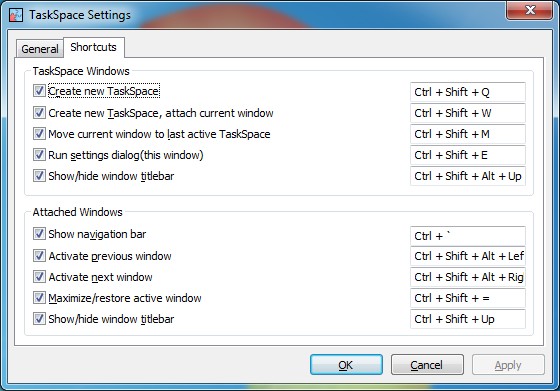 TaskSpace features the ability to attach ANY window to the TaskSpace box(drag & drop), unite boxes as tabs(drag & drop), collect different applications in a single box, save/load TaskSpace configurations, support for themes, and intelligent alignment/adjustment for applications when box resized. You can easily manage it from the systray (create new box, switching, exit) and there is no installation required.