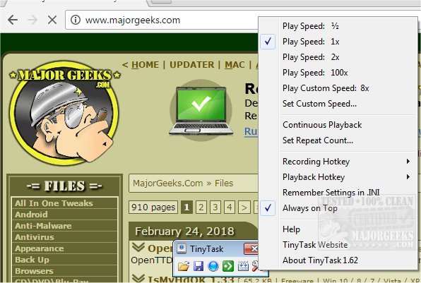 There is no significant configuration needed you just download and run it. Once you have run the program, you are presented with a tiny floating window that contains all that you need to begin recording your desktop activity. Other programs provide you with a description of a specific function when you hover its icon, TinyTask does not, but it isn't a factor because everything is pretty self-explanatory. The recording is seamless, and playback is equally so. It will play in fullscreen precisely as recorded and will perform tasks that have been recorded during the session. You do have some minor playback options like preset/custom speeds, continuous, and repeat. It can be set to record and playback via several predefined hotkeys as well as always on top so you can keep track of the very tiny window. All recordings can be saved to a location of your choice.