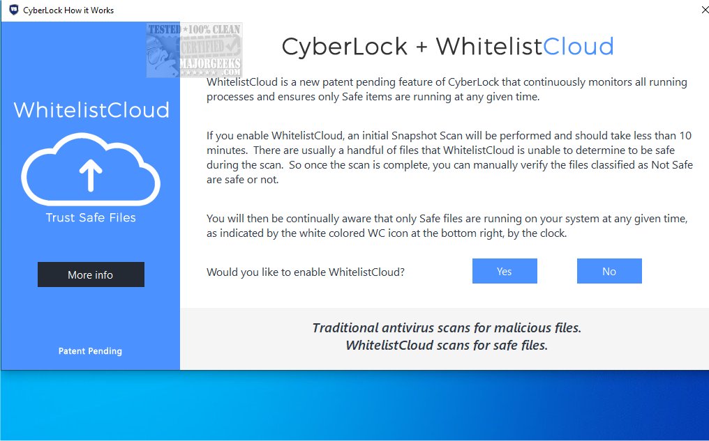 In contrast to conventional antimalware protection software, CyberLock does not actively block malicious content. Instead, it operates by permitting only the execution of software that is included on the whitelist, effectively blocking all other applications.