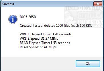 This little benchmark utility will assist you in gauging the rotation speed of a hard drive. Multiple factors that make up a hard drive's performance, like the drive's rotation speed, the mainboard chipset, controller drivers, SATA/AHCI mode, and RAID configuration, can all figure in for performance. Vov Disk Benchmark was designed to make the testing process simple. This simplicity is evident in the UI, which is straightforward with large buttons for the two test types; big and small file test options. There is a drop-down for the drive selection, and that is it. When you run a test, a progress indicator bar appears as it runs through its paces. Once completed, you are given the results in a pop-up window that outlines the read and write speed/elapsed time for the selected drive and the tested file size.