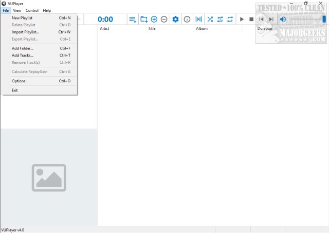 The interface is a nice-looking white with black fonts and blue icons and highlighting. Most of your settings are laid out in four tabs: File, View, Control, and Help. Most common actions are available as icons across the top of the app. For example, you can add, remove, or modify playlists and control whatever you're currently playing. Online documentation is available.