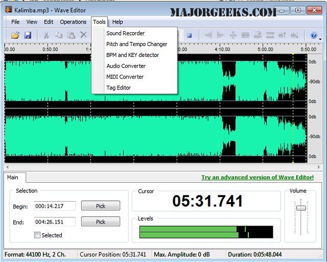 Wave Editor is an easy-to-use digital audio editing tool with many supported formats and operations.
