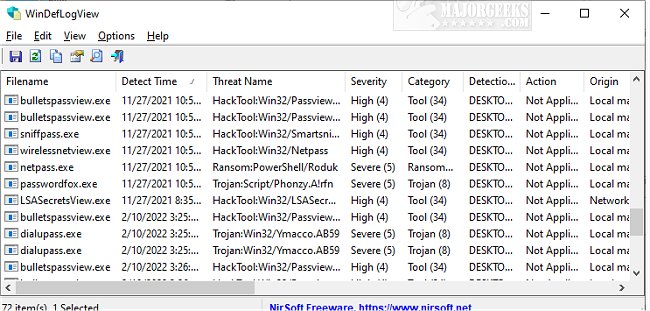 As with most NirSoft apps, WinDefLogView displays the following detail: Filename, Detect Time, Threat Name, Severity, Category, Detection User, Action, Origin, and more. Any found data can be exported for use at a later time or for merely tracking and recording events over time.