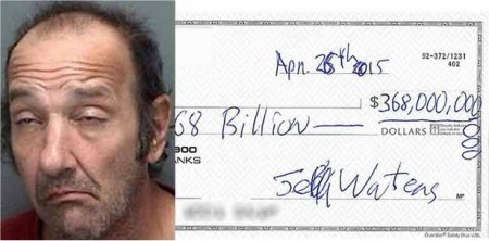 Jeff Waters attempted to cash a check for $368,000,000,000 at Bank of America in Jacksonville - the tellers suspected something was wrong and notified authorities. Waters claims that a homeless man named Tito sold him the check for $100.00 and he was going to use the Billions to start an Italian restaurant - underwater.