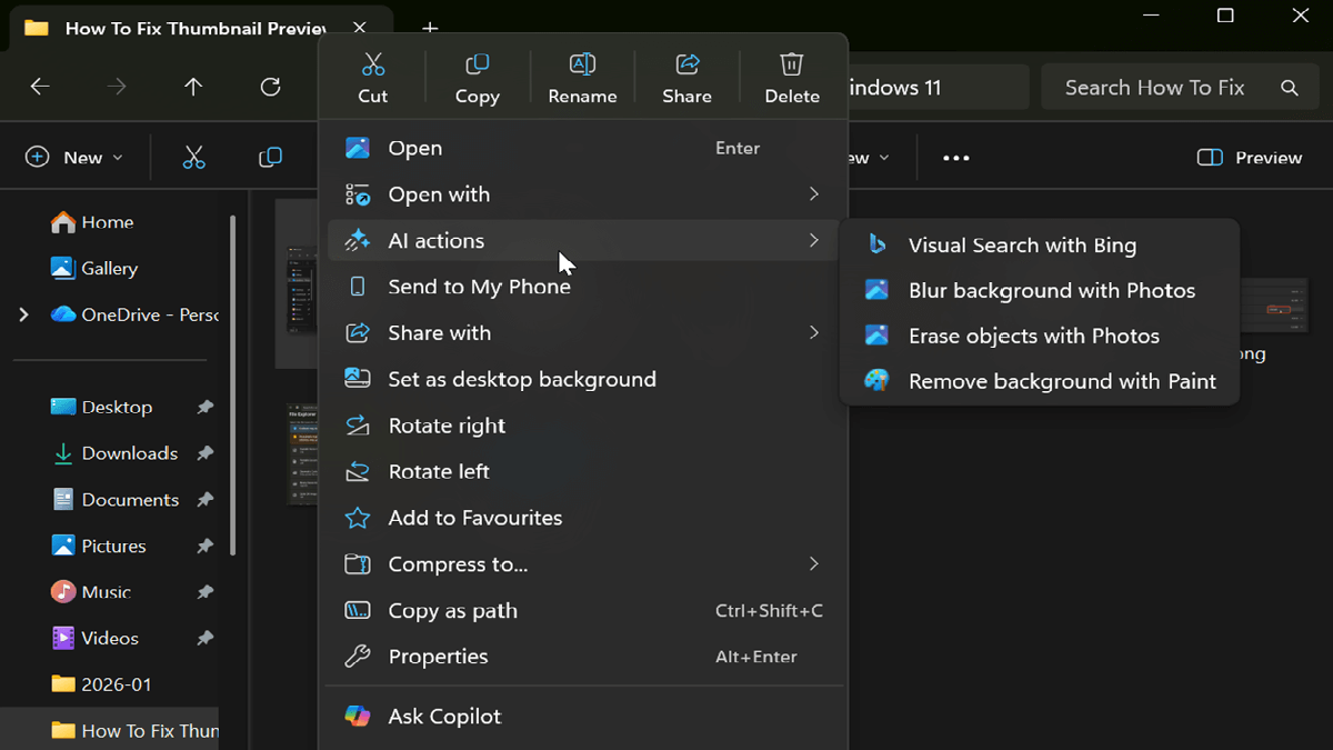 AI actions are shortcuts in File Explorer to existing Windows 11 AI features. You can access them by selecting a file, right-clicking it, and then choosing AI features from the context menu. Currently, they're only available for images (.jpg, .jpeg, and .png) and Microsoft 365 files.