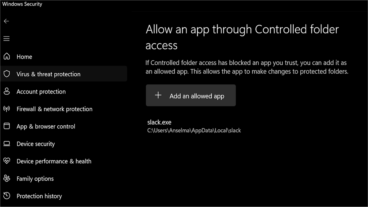 - Under Controlled folder access, select Allow an app through Controlled folder access.