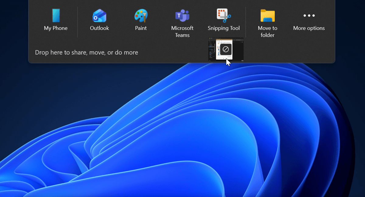 Have you noticed a tray appear at the top of your screen when you drag files? It says, "Drop here to share, move, or do more." You can then drop the file into one of the listed apps or your phone, move it to a folder, or select More. The More section will list even more apps, email contacts, and nearby devices. It works the same as "Share with" in the right-click context menu. If it's an image file, you can also edit and compress it before sharing it.