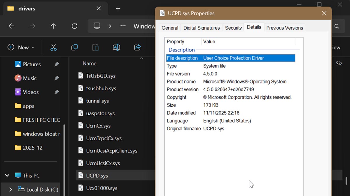 UCPD is a driver-based protection that can block changes to default file type associations by third-party software. It prevents their access to UserChoice registry keys in Windows 10 and 11. These specific registry keys define your default app choices for web browsers and PDF viewers, for example. You can find UCPD in C:\Windows\System32\drivers.